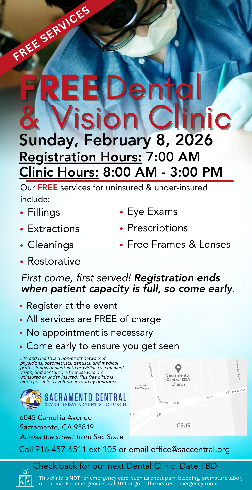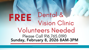 Free Dental and Vision Clinic Registration starts at 7AM. This is first come, first served. Spaces are limited and services are free. 6045 Camellia Avenue, Sacramento CA 95819 + Add to Google Calendar + iCal / Outlook export 00 days 00 hours 00 minutes 00 seconds Date Feb 08 2026 Time 8:00 am Category Community Services Events Family Health Share this event
